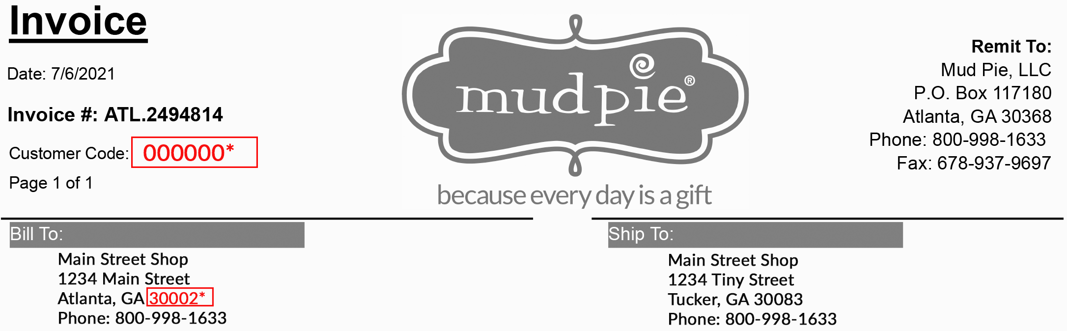 *Your customer code and billing zip code can be found on the top left corner of your Mud Pie invoice.  See example invoice.